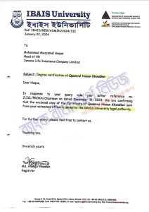 কামরুল হাসানের দুরশিক্ষনের মাধ্যমে ডিমড ইউনিভার্সিটি অব লক্ষ্ণৌ, ইন্ডিয়া হতে অর্জিত বিদেশি ডিগ্রি ও ইবাইস বিশ্ববিদ্যালয় হতে অর্জিত দুটি ডিগ্রির সনদই সঠিক, ইবাইস কর্তৃপক্ষও তা সঠিক আছে বলে প্রত্যায়ন করে।